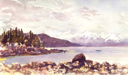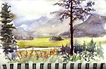 In the meantime my job is to make things easier by helping with chores around the house, paint watercolors for a local gallery and for material for etchings in the winter and to learn as much as I can about the local fishing, hopefully stocking the freezer in the process. Dianne and I were invited for wine at the Blueberry Lodge where her etchings line the walls, and they wanted a watercolor of their view. I started with a simple sketch and worked it into this painting.