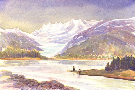 The four day weekend for Fourth of July brought a lineup of ten to fifteen cars every time drove past. I didn't want to see the small creek mouth with that many anglers and knew I would have no room to flail with the fly rod, so I left it for those who cannot fish during business hours on regular workdays. I heard they caught quite a few. I had my photos developed and worked up a painting of the creek mouth with the background of the Mendenhall Glacier.