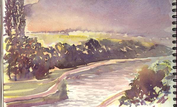 I woke at dawn Sunday and only one person walked past me in two hours of sitting on a bridge while painting the other. The absorbent watercolor paper wouldn't dry at all so I painted the pencil sketch.