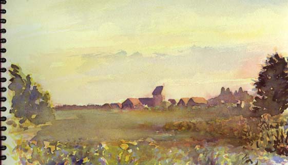I still need to paint in the purple ridge of rooftops of the small town. It would have smeared so I will attend to it later.