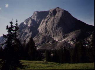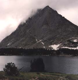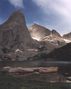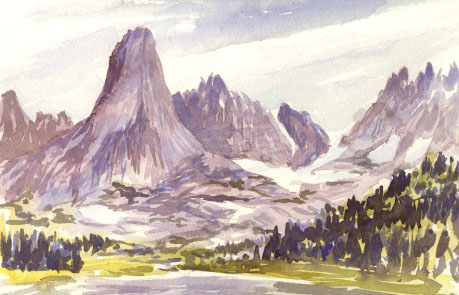 Mt. Mitchell rises to 12,482 feet at the southern end of the Wind River's main attraction, the Cirque of the Towers. Beneath and between the thirteen peaks are snowfields and glaciers, melting to form Lonesome Lake and the headwaters of the Popo Agie (po-poje) flowing our through a meadow opening down to the south.
