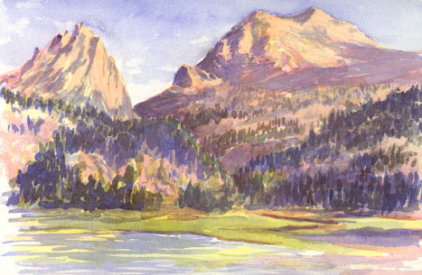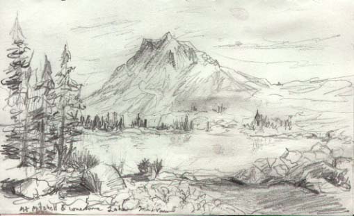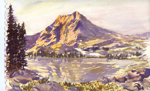 Morning was clear and I woke before the sun to catch it's dawning alpenglow. The scene was changing too fast to paint and the colors didn't come out in the direct photo, only a hint of it in the photo of the mountain's reflection. I took some notes on the colors and sketched in pencil, a view from a bit further back up the other side of the lake.