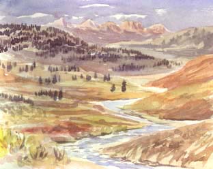 Saturday the 30th we packed a lunch and filled two cars with three generations of the Laws & Callaway clan, Karen's uncle Jack and Aunt Jean, and Alicia who helps with the kids and cooking. The Taylor Fork is a small beautiful and still wild tributary of the Gallatin just outside the park, the favorite local water of Karen and her dad Dick. We found a shady spot for the kids and Karen and Dick started fishing there while Jack and Jean and I drove a mile upstream and started there. We leapfrogged up fishing dry flies in the pools and riffles and together we covered three or four miles, all catching at least a few of the small wild rainbows and native cutthroats. I took an hour out to climb a small hill along the river to gain a view up the long meadow section for a midday sketch.