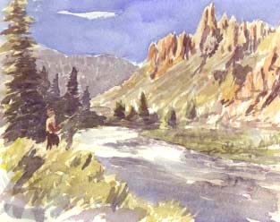 As it turns out, Karen couldn't make it to Cliff lake. I slept there and with frost in the morning and my sore thighs I felt more like eating an inside breakfast and moving north to Bozeman for a town day. I stopped and painted a nice view of the Gallatin, a larger work that I will have to finish sometime later.
