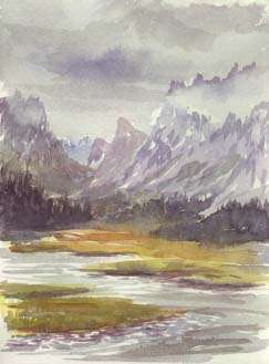 Saturday we took a dayhike up into the Tetons - a 3,000 foot climb over five miles up to Amphitheater lake at the base of Grand Teton itself. I carried larger paper and from the lake painted the breathtaking view of Grand Teton and surrounding mountains, with a pencil to speed up the layout. I had to stop so we could make the hike back down before dark, and look forward to finishing it as an antidote to cabin fever this winter.