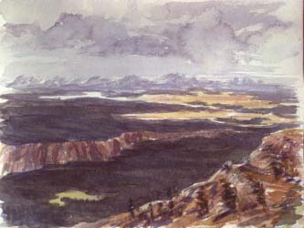 Wednesday I woke early and fished a mile of Tower creek above our camp, slipping on the frost laden downed burned trees that are evident throughout the park. When I didn't come back in an hour Deedee knew I didn't catch anything. Rain threatened but we left camp for a hike up Mt. Washburn. As we arrived at the trailhead the wind and rain cut loose and poured rain and hail. Soon it passed so put on raingear to started the three mile hike anyway. We met many shivering hikers coming down in shorts and shirts. Small bursts of rain came and went as we continued up the gradual trail, skirting around the mountain to see changing views in different directions. The Beartooth range to the northeast led to Yellowstone Canyon, Hayden Valley and Yellowstone lake to the south, and briefly the skies cleared to show the Tetons beyond. To the west stretched long expanses of grey burned timber, all the way to the horizon. I hope to paint more from the photos we took, but considering the weather I was lucky to get this sketch looking south from a protected outcrop near the summit.
