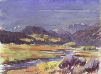 I drove on through Estes Park and into the Rocky Mountain National Park entrance. It did not matter where I went; on such a beautiful day after so much rain and wind I felt I could have painted anywhere. I took a turn following a sign to Moraine Park and found a beautiful meadow, with kids and tourists fishing in the lower reaches. Upstream I found braided channels, thick willows and fly anglers. This upper section looked better for fishing but the thick brush and close mountains blocked the views for painting, so I retreated back down to the first parking area, walked a quarter mile and sketched at the open meadow looking upstream.