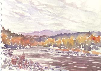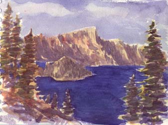 The area around Klamath Falls holds some of the largest trout in North America. It is accessible from northern California but I had never fished it. I checked the regulations and the rivers had closed on Halloween and the lake was whitecaps so I'll have to come back. Crater Lake was another close destination. The entry gates were unattended and just a skeleton staff remained. I was one of about five tourists there. The wind howled so yet again I had to seek a view where I could paint from the truck, so this picture is about the same view as anyone could get without even leaving their car. Winter had overtaken me and it was time to return to California. I drove south to my friend Annika's folks in Ashland.