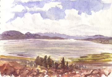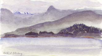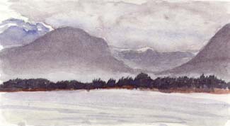 I made the ferry that night. It rained most of the way so I sat by a window in the bar, sipped Alaskan Ale and sketched in pencil and filled in the colors as the beautiful misty mountains and island slipped steadily by.