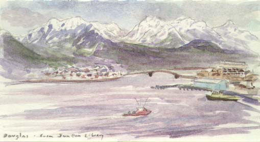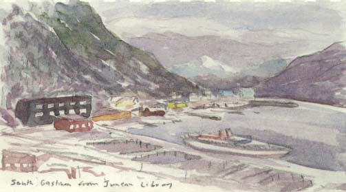 I had some free time while Dianne worked, so I walked around Juneau with my camera and sketchbook. The mountains rise straight from the shore five thousand feet, as impressive as Yosemite, bands of islands with their own snowcapped mountains protect the coast as in Maine, and glaciers flow from the icefields to the shore in valleys that are their own Yosemites in the making. A cleared swath of avalanche looms threateningly over the north edge of downtown, but Dianne lives safely across the Gastineau Channel on Douglas Island. It was too cold to paint outside so I sat in a corner of the library that sits above the most scenic waterfront parking garage in the world, and painted looking across to Douglas.