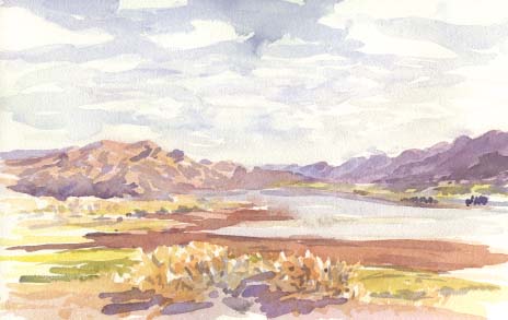 Kate and I drove up the valley to Fort Bidwell, stopped at Fee reservoir to catch two good trout for a dinner offering to our hosts, then drove around trying to pick a view to paint. Everywhere we looked was beautiful, pastoral and well-kept ranches framed by red rock mountains. It is a place where one could paint for a few years and still find fresh views. I painted this one looking back to Cedarville from halfway across the causeway between the lakes.