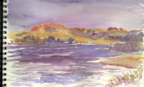 My painter friend Kate lives on Tomales Bay, and we try to get together every now and then to hike and paint along the coast. This summer our painting day conflicted with her massage appointment, so while she got worked over I stopped at the store in Inverness and painted, looking across Tomales Bay to Elephant Mountain and Point Reyes Station.