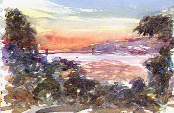 Rather than fight the crowds at the trendy San Francisco restaurants, I often get take out and hustle up the stairway sidewalks to Coit Tower. There are always people but same as on the rivers a short walk from parking finds more solitude than you would expect, a place to sit and eat and sketch. This was after a fine sunset repast of Caffe Sport pasta pesto, fresh bread and red wine.