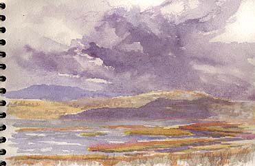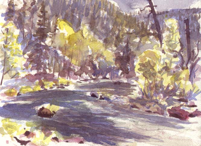 A friend of a friend, Mark Tompkins, had moved to California and had long held a reverence for the beautiful McCloud river rainbow trout that over the last century have been stocked worldwide. Together we enjoyed fishing for these fine ambassadors of Calfornia trout fishing in their native stream. As usual the mornings and evenings held the most promising fishing and provided time for a watercolor. Inadvertently I used the back of the Eagle lake painting in my watercolor book.