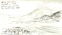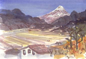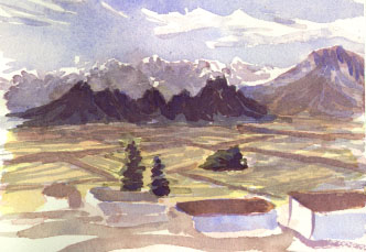 Each little piece of land was bordered and tilled, and even small corners were planted, making the most of the flat bottom land. We recognized only cabbage and oranges among many crop rows and orchard groves. In the distance to the north rose a solid wall of snowy mountains, looking cold and inpenetrable behind an independent cluster of dark and sharp smaller peaks much closer.