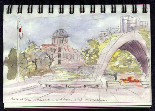 I'll carry it with me for the rest of my life, and sprinkle a few grains down the shirt or pants of the next few people I hear utter the all too common "we should go in there and bomb the shit out of them". I couldn't enter the museum in the condition I was in so I stayed outside and painted. Anne toured the museum. Among the burnt artifacts and dioramas of destruction were telegrams from the Mayor of Horishima to leaders of nations still developing and maintaining nuclear bombs, including a recent one to President Clinton.
