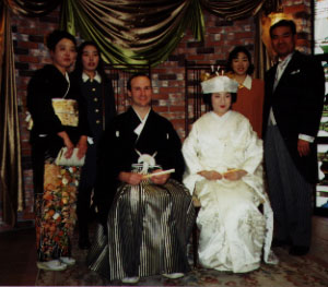 The wedding ceremony was very small; there were three close friends of Shizuka, one of which had traveled from Germany, and the immediate family that we had already met. Mike in a black and Shizuka in a white kimono walked together unaccompanied through a small garden to meet the assembled gathering in a sparse but formal room for family picture taking, then we were led into a temple. The wedding was initiated by a robed priest who shook a staff of paper, rang bells, and spoke ceremoniously with three girls punctuating with recitations and bells. Since I could not understand any of it I enjoyed it as music. Mike and Shizuka together read their vows in Japanese from a scroll, Shizuka adeptly pausing to time her responses with Mike's careful pace, then exchanged rings. There were no tears and no rice. We exited in formation behind the nwelyweds into an amazingly well equipped photo studio with lights and multiple large format Nikons on robotic arms with central hydraulic controls, for a formal group photo.